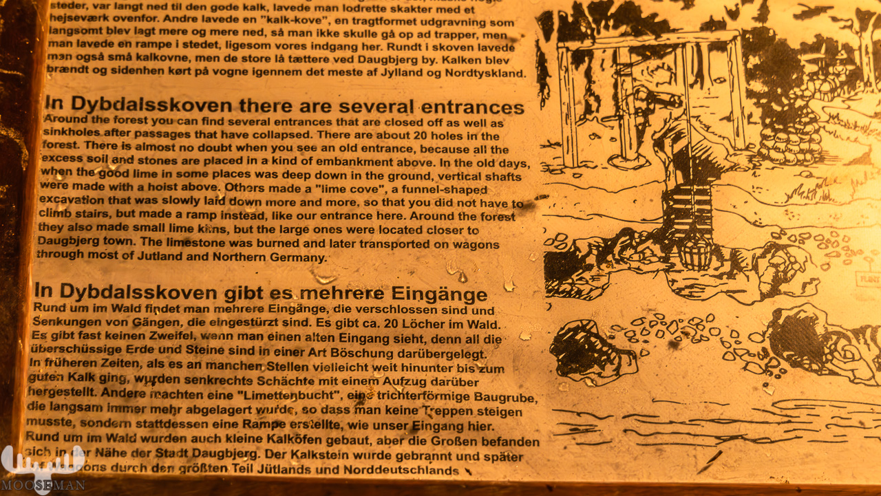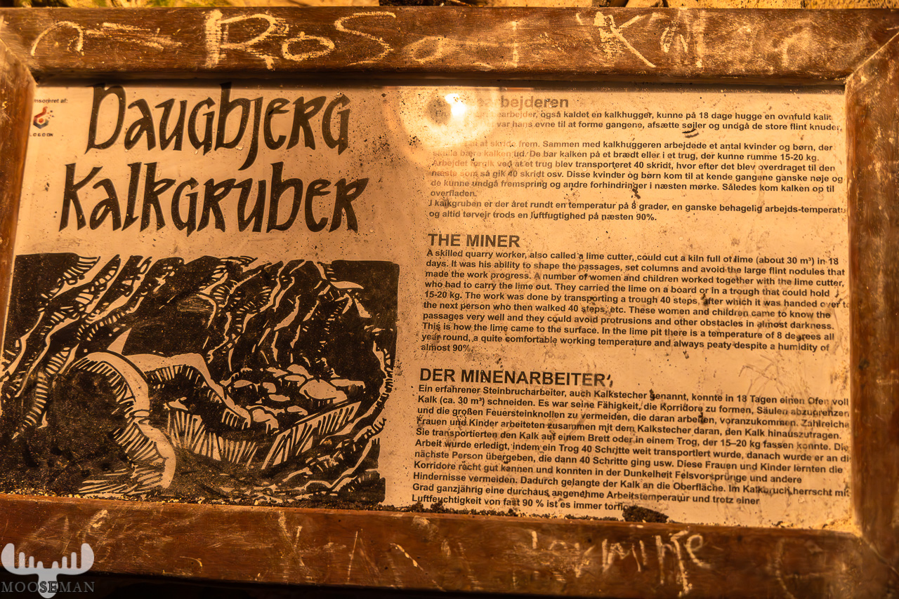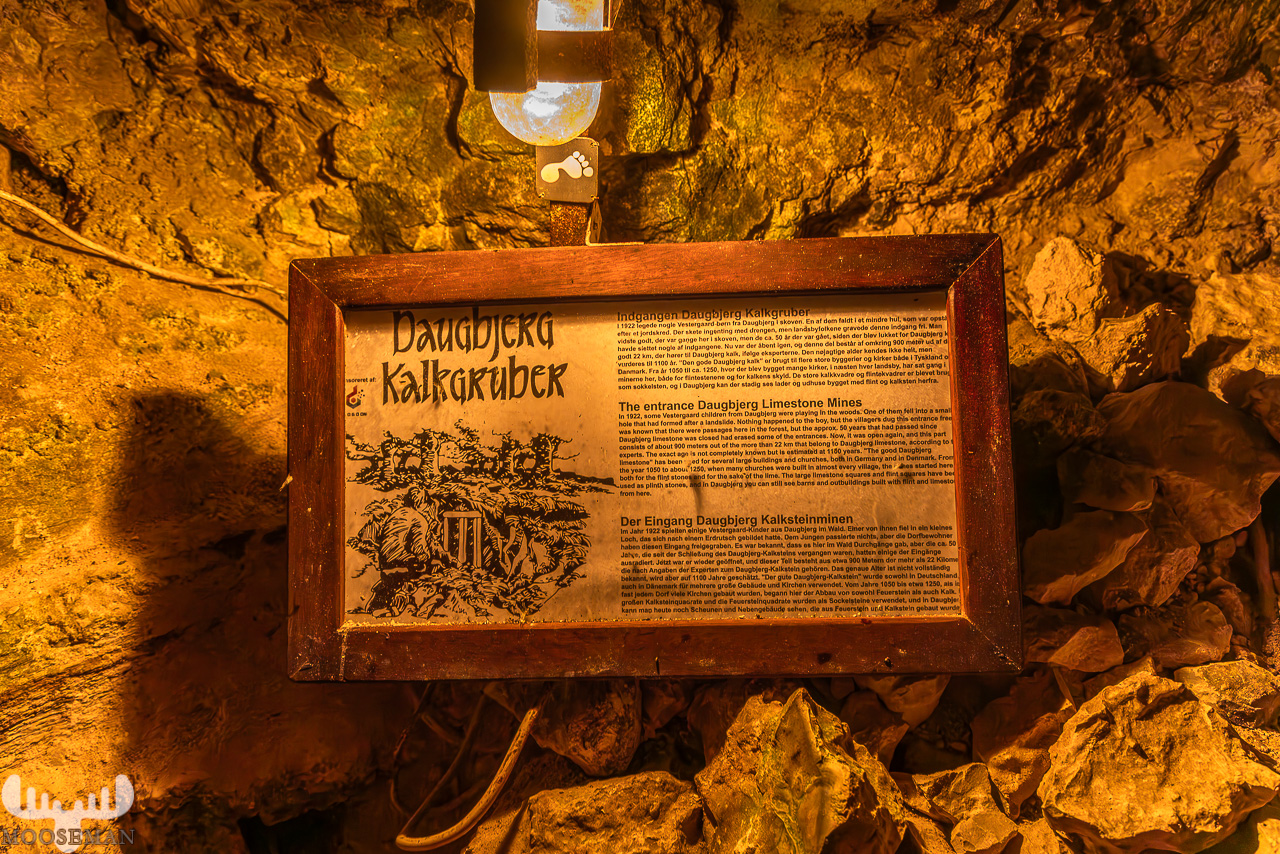 Mit über 1000 Jahren sind die Daugbjerg Kalksteingruben die ältesten ihrer Art in Skandinavien. Die Gänge, die die Menschen in mühseliger Handarbeit in den Kalkstein gegraben haben, habe insgesamt eine Länge von 22 Kilometern! Für die Besucher sind aber nur etwa 900 Meter zugänglich. Bis 1872 wurde hier Kalk abgebaut und europaweit verkauft – unter anderem für bedeutende Gebäude wie den Dom zu Ribe. Der Zugang wurde erst vor etwa 100 Jahren zufällig von wiederentdeckt als Kinder beim Spielen mit dem Fuß in ein Loch der Grube getreten sind.