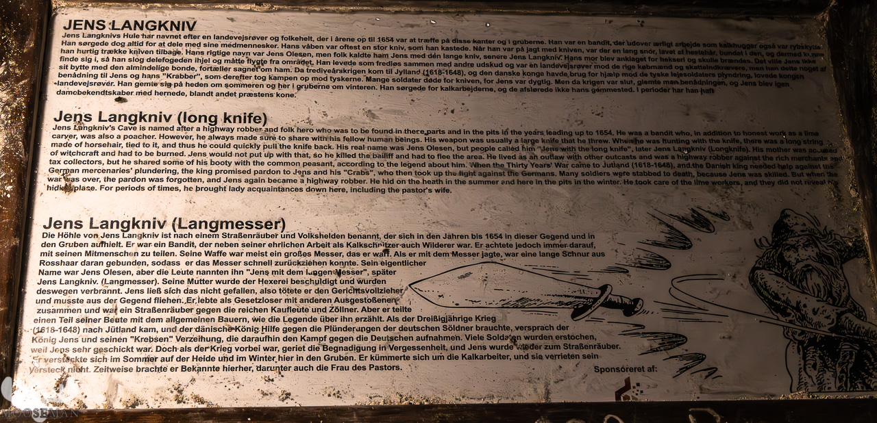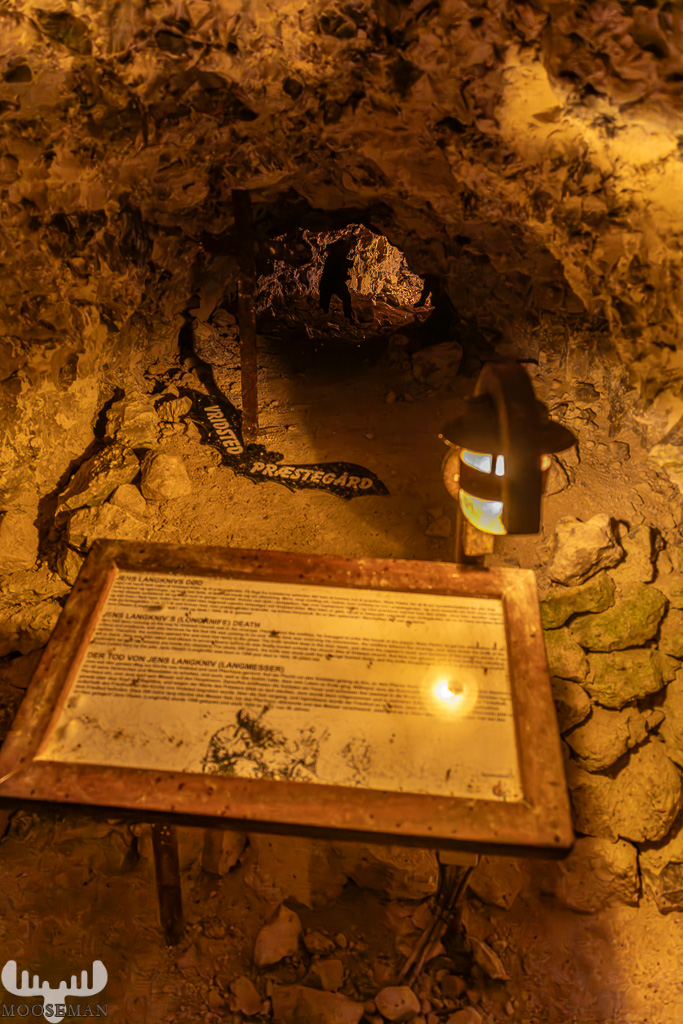 Das haben sich dann wohl auch zwielichte Gestalten zu Nutze gemacht um sich in den Tunneln zu verstecken. Über einen offenbar sehr bekannten Gauner des 17. Jahrhunderts – Jens Langkniv (Jens Langmesser) – findet man in den Gängen ebenfalls Informationen – er wird als der jütländische Robin Hood gefeiert, weil er die Beute aus den Räubereien den armen Grubenarbeitern schenkte. Diese haben ihn natürlich im Gegenzug auch nie verraten.