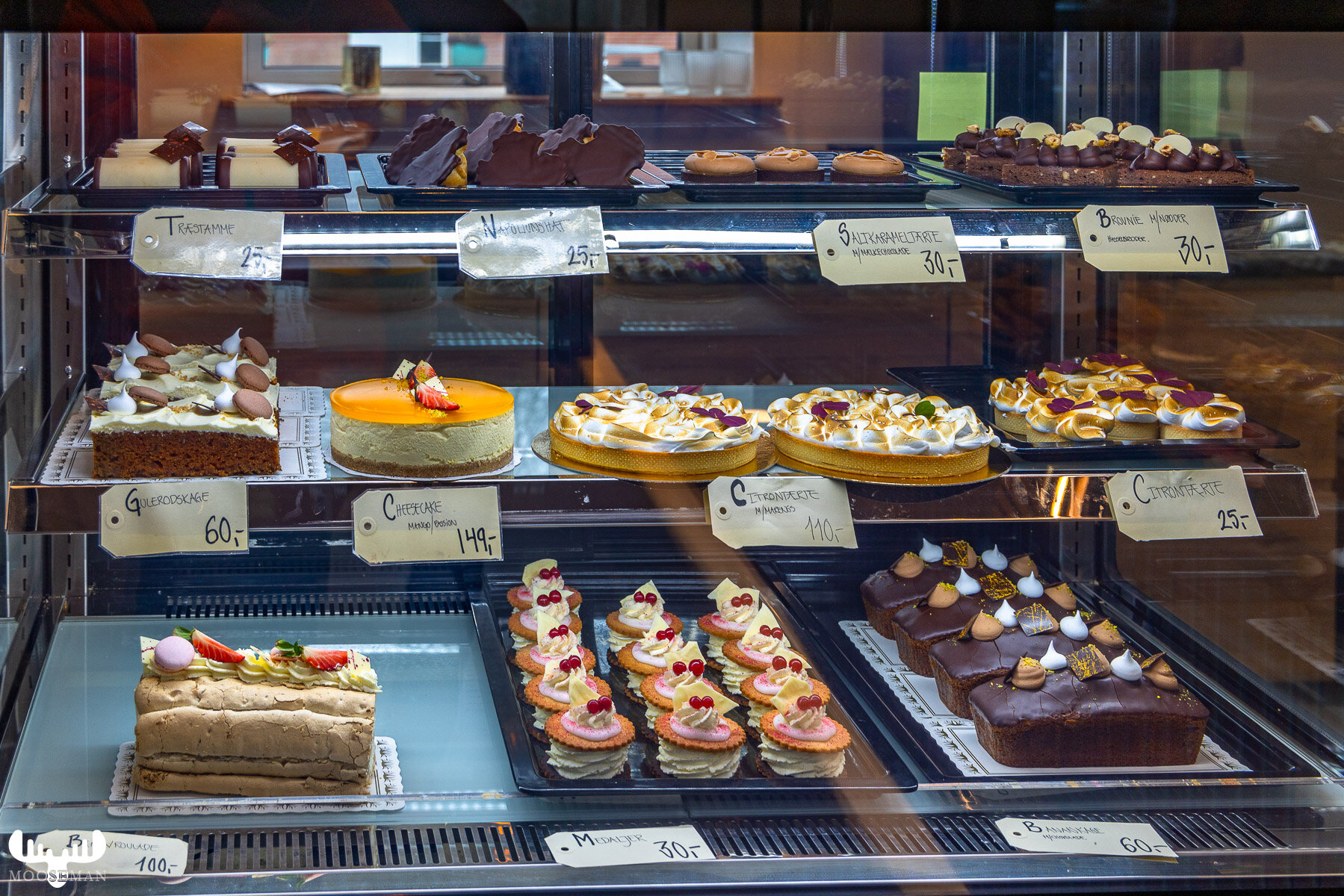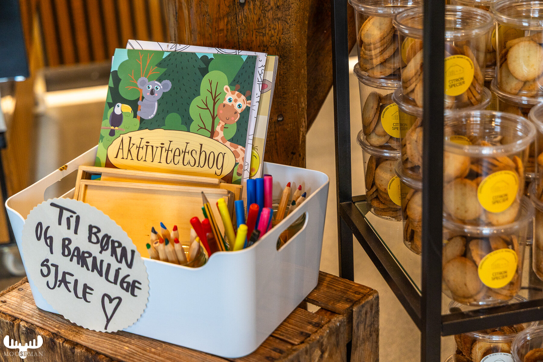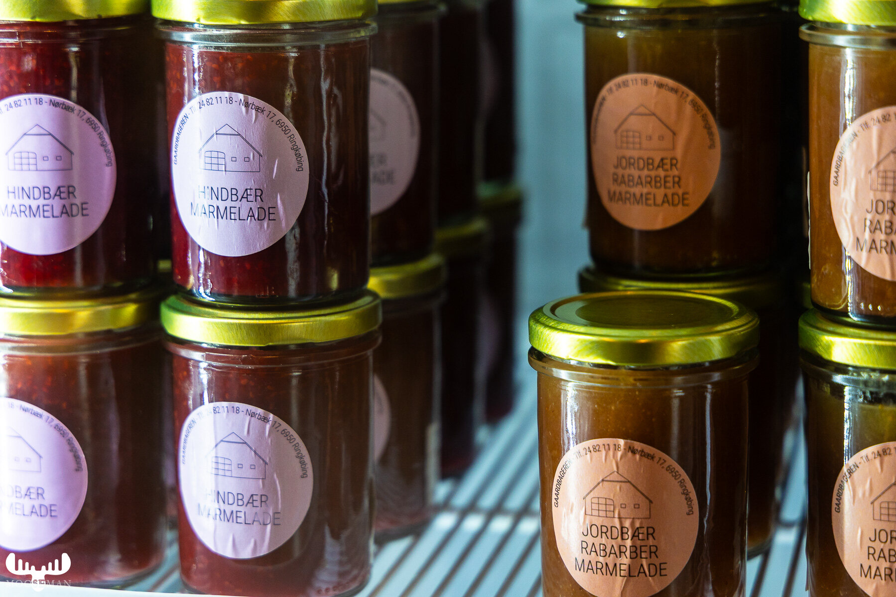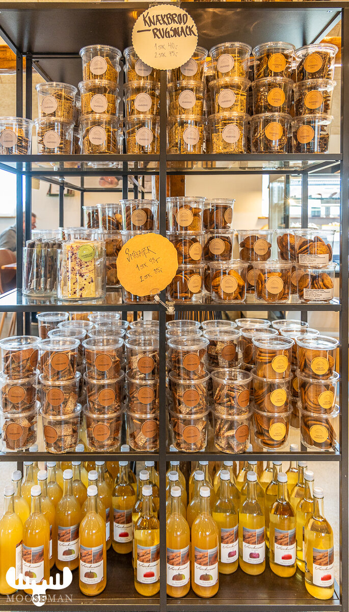 Im Laden gibt es neben den frischen Back- und Konditorwaren, die hinter einer Glasscheibe in der Backstube direkt hinter dem Tresen zubereitet werden, auch selbstgemacht Plätzchen, Schokolade, Soßen und Marmeladen sowie leckere Sandwiches. Und natürlich findet man auch Kaffee und Kaltgetränke wie zum Beispiel Vesterhavsmost Apfelsäfte.