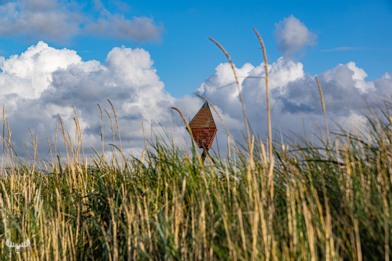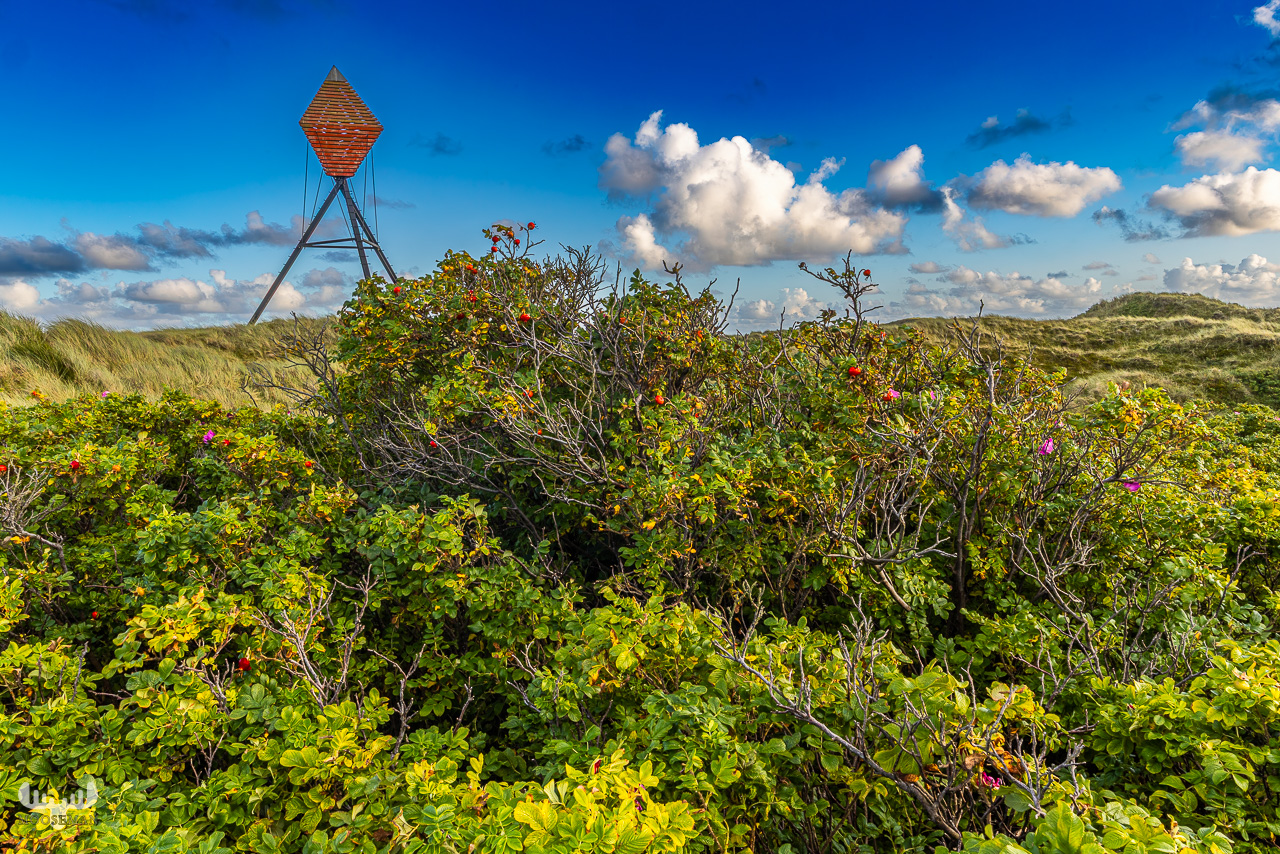 Ganz in der Nähe zu der Bake – näher am Meer auf dem vordersten Dünenkamm – sind weitere Seezeichen zu finden: Runde Scheibe mit rotem Punkt, darunter ein auf der Spitze stehendes Quadrat), die auf den Bildern auch zu finden sind.